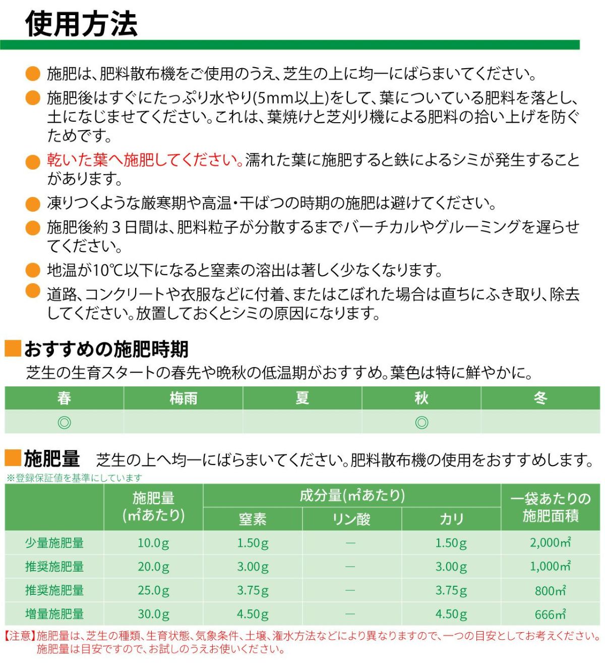 | 「最近芝生に元気がないな。」そんな時は養分が足りなくなっているかもしれません。 芝生の状態に合わせて最適な肥料を選んであげて芝生に元気を取り戻しましょう。 ただしあげすぎにもご注意。適量を守って最適な時期に肥料を散布してあげてくださいね。 ・芝生に肥料をあげる時期について 芝生には大きく分けて夏の暑い時期によく生長する高麗芝や野芝を代表とする暖地型芝と冬も緑のベントグラスやケンタッキーブルーグラスを代表とする寒地型芝にわかれます。 暖地型芝と寒地型芝は生育の時期が異なりますが肥料をあげる時期については基本的は変わりません。 暖地型芝と寒地型芝に肥料をあげる時期は3月から11月までの期間となり、頻度は肥料の種類によりますので説明書きを参考にしてください。 ・晩秋の施肥が来年に効く! 暖地型芝は冬になると休眠しますし、寒地型芝も気温が低くなりますとほとんど生長しなくなります。しかし次の春に向けて晩秋前の時期にあげる肥料はとても大事なんです。秋にしっかり肥料をやりますと春の芝生の芽吹きがよくなるのでおすすめです。 |