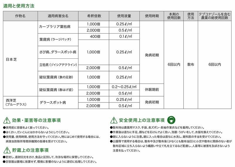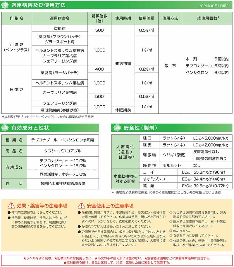 他の画像を見る /使用説明書付き/ラージパッチを始め、幅広い病害に優れた効き目を示す総合殺菌剤。 芝生用殺菌剤 タフシーバフロアブル 1L入り 販売価格 ¥ 11,550 税込 カートに入れる お気に入りに登録する