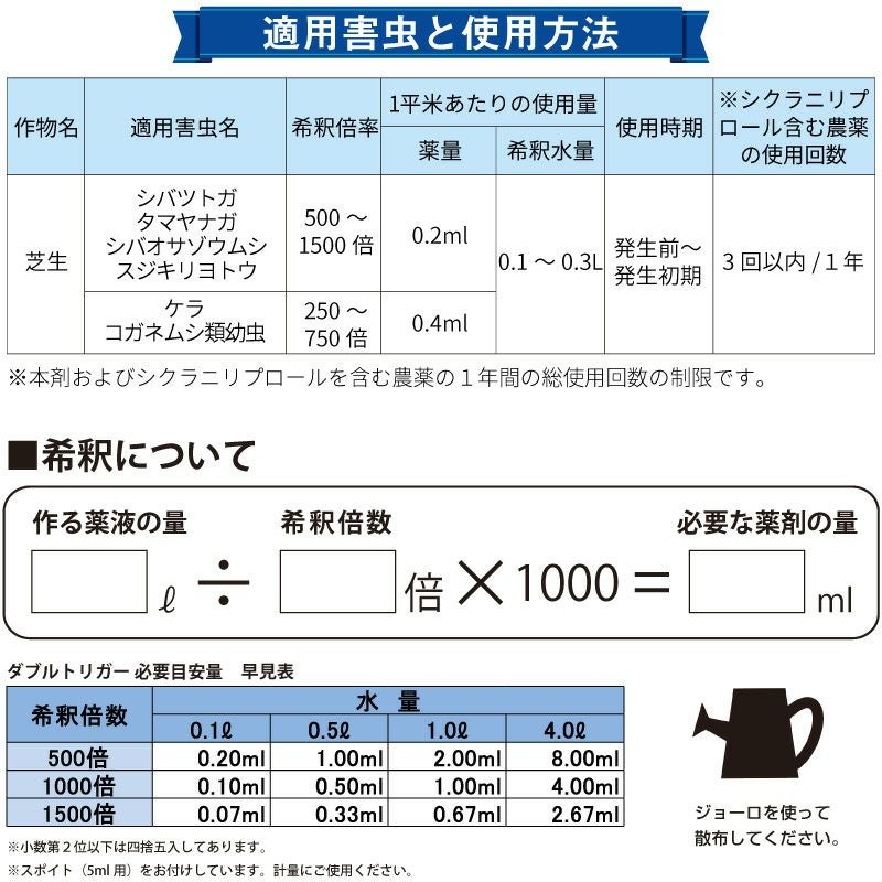 他の画像を見る /使用説明書付き/計量スポイト付き/幅広い害虫に効き、長期間の高い効果が持続します。 芝生用殺虫剤 ダブルトリガー液剤 500ml 販売価格 ¥ 9,900 税込 カートに入れる お気に入りに登録する