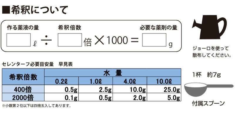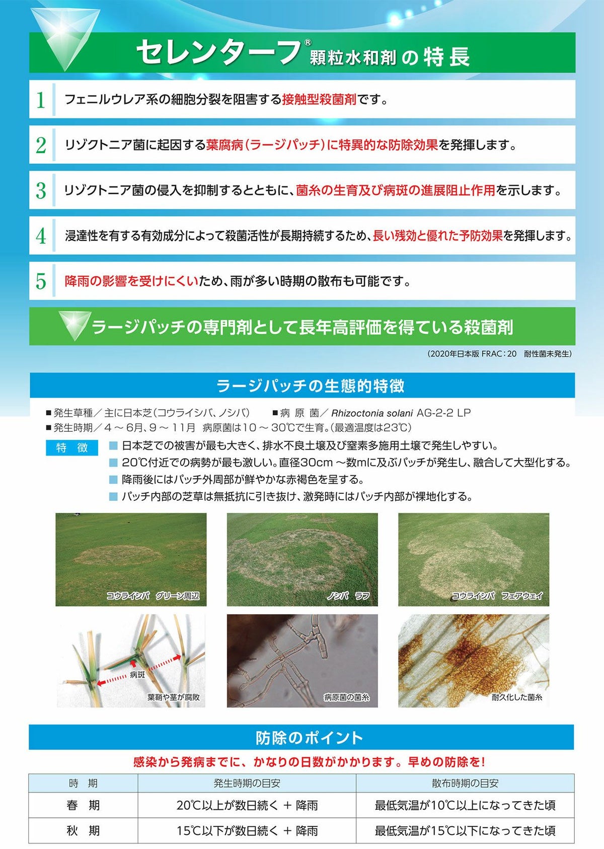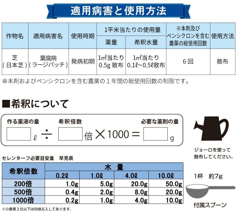 他の画像を見る /使用説明書付き/計量スプーン付き/日本芝の葉腐病(ラージパッチ)に特異的な防除効果を発揮する殺菌剤。 芝生用殺菌剤 セレンターフ顆粒水和剤 1kg入り 販売価格 ¥ 11,000 税込 カートに入れる お気に入りに登録する