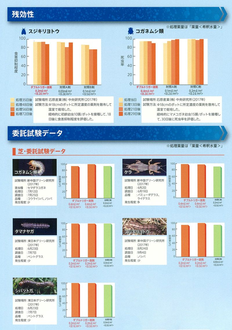 | 適正倍率で散布すれば芝生に薬害はありません。プロが使う薬だけを揃えました。対象害虫にあわせて殺虫剤を使い分けると、効果テキメンです! |