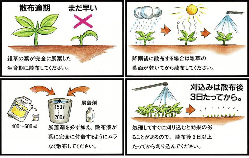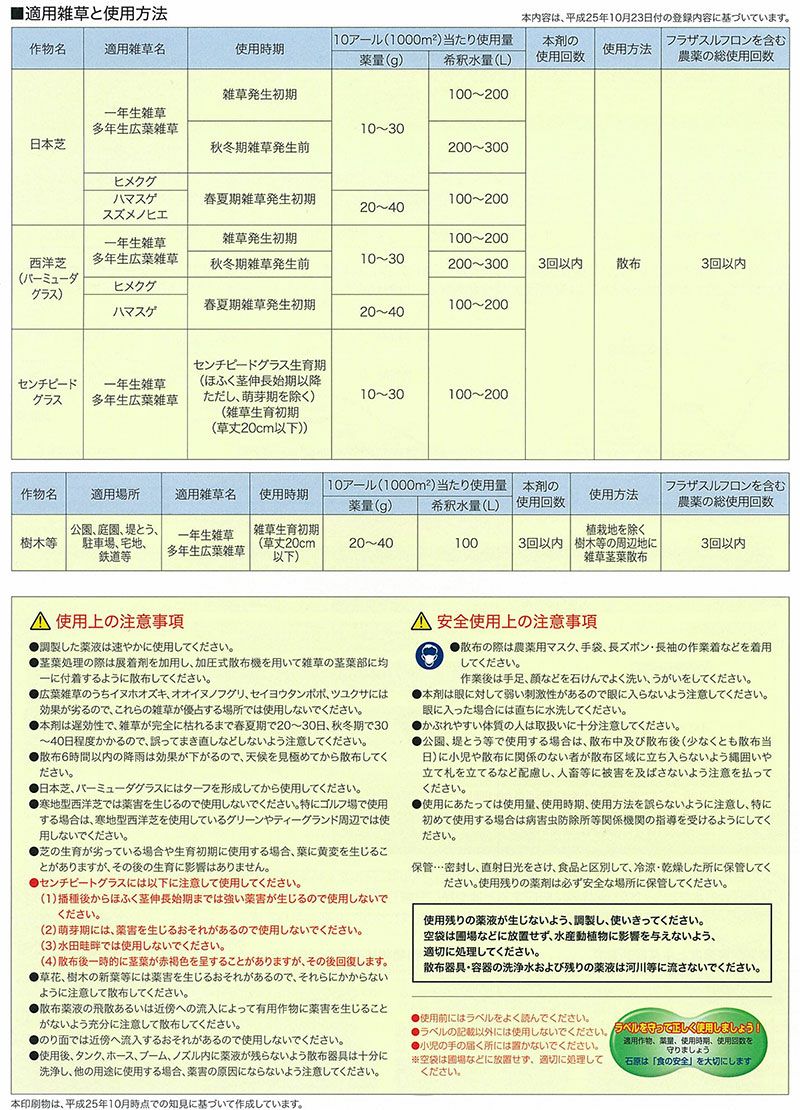 ・芝張り直後やエアレーション作業後は薬害を受けやすいので、ご使用をお控えください。