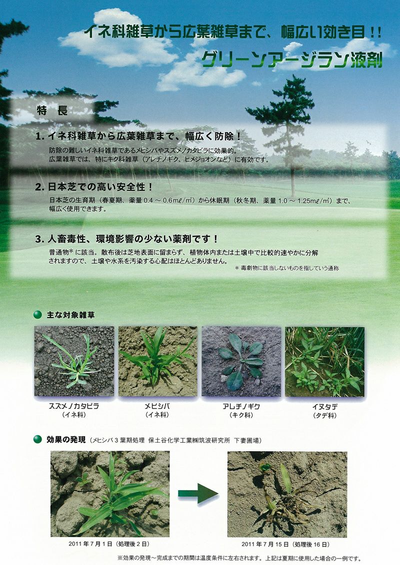 クサブロック一年生イネ科雑草の発芽を予防する除草剤。 日本芝(高麗芝、野芝)、西洋芝(ケンタッキーブルーグラス、ベントグラス)限定 |