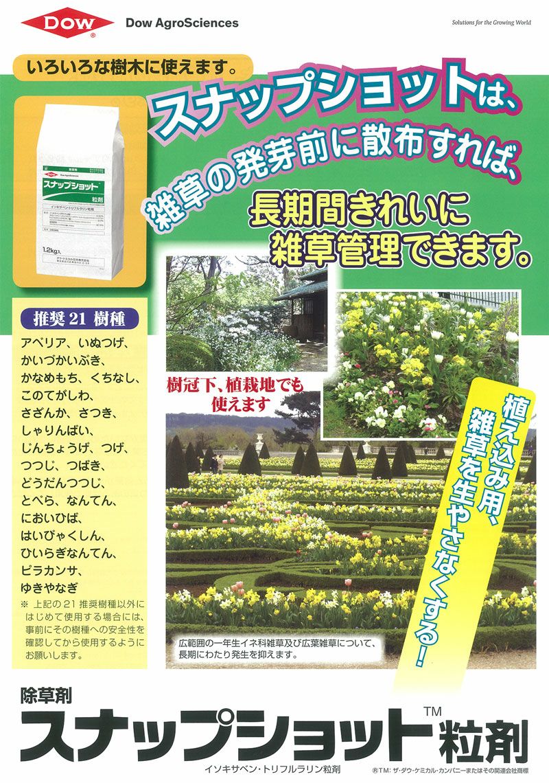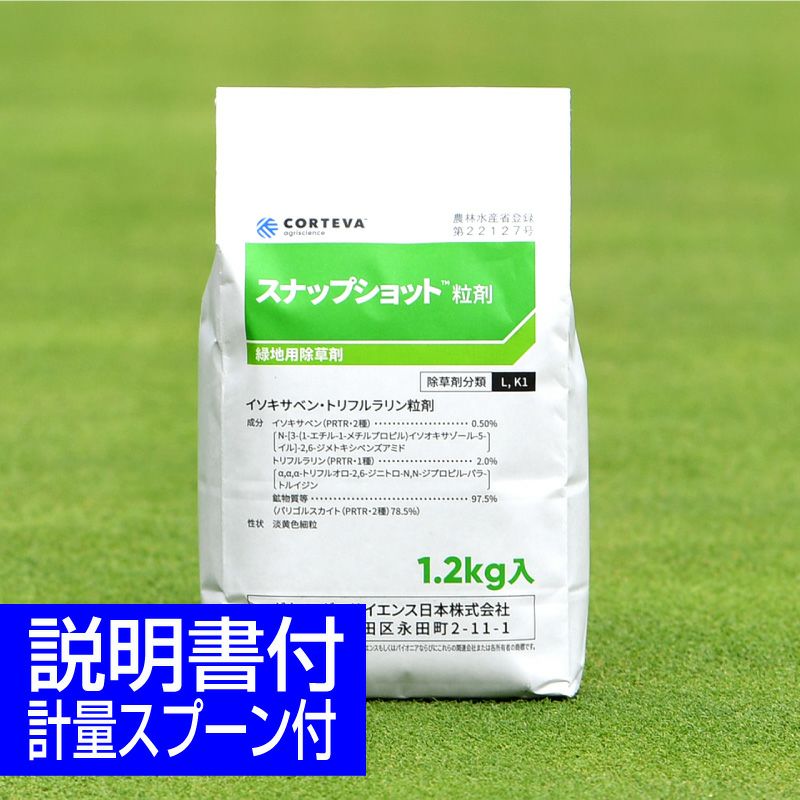 スナップショット粒剤 【おすすめ】 一年生イネ科雑草、一年生広葉雑草の発芽を予防する除草剤。 日本芝(高麗芝、野芝)限定 水に溶かす必要もなく、そのまま散布するだけで雑草の発生を抑えることができます。 |