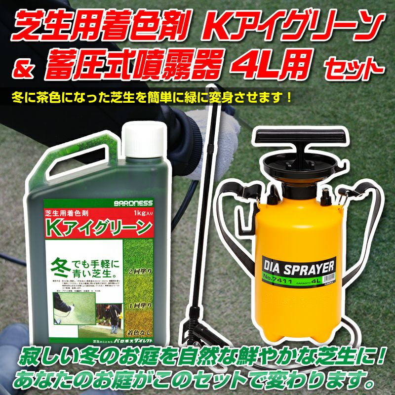 着色剤散布セット 芝生用着色剤 バロネス Kアイグリーン 1kg&蓄圧式噴霧器 単頭式ノズル 4リットル用 日本製 fp-7411