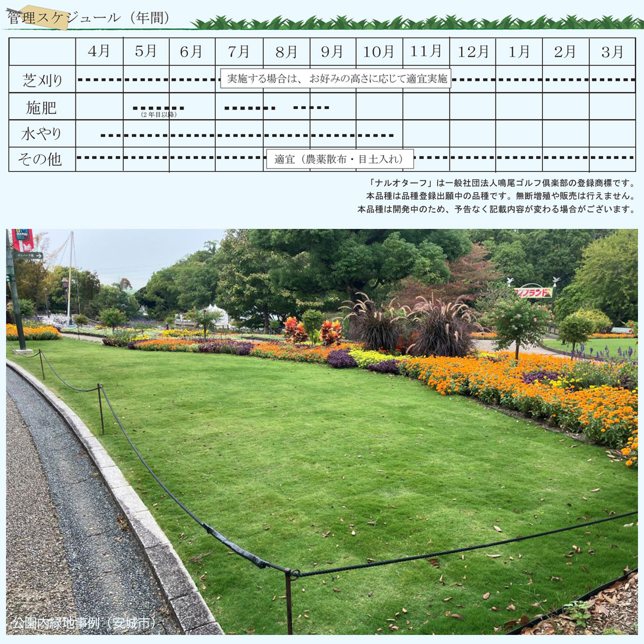 全国の公園、商業施設、一般家庭や屋上緑化などで利用され、様々な用途で使用されている芝生です。春、夏、秋の年3回、全芝生農場を対象とした調査を行い、その時期の芝の生長、栽培管理状態等を細かくチェックするなど、優れた品質を誇る芝生作りを行います。