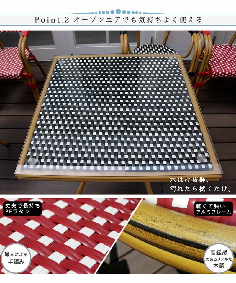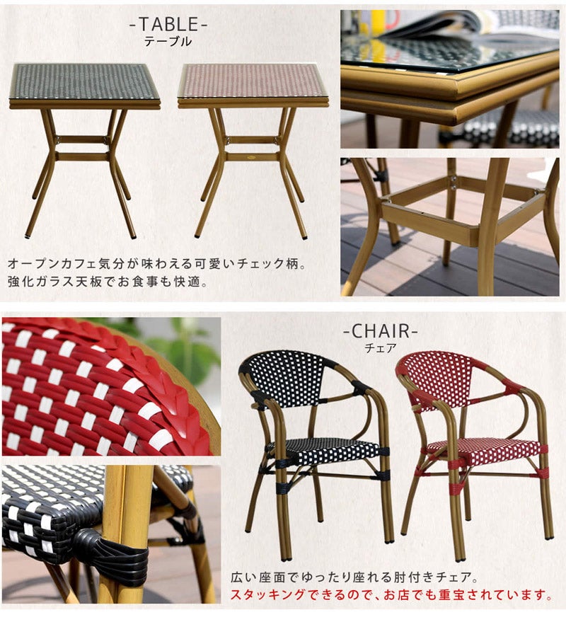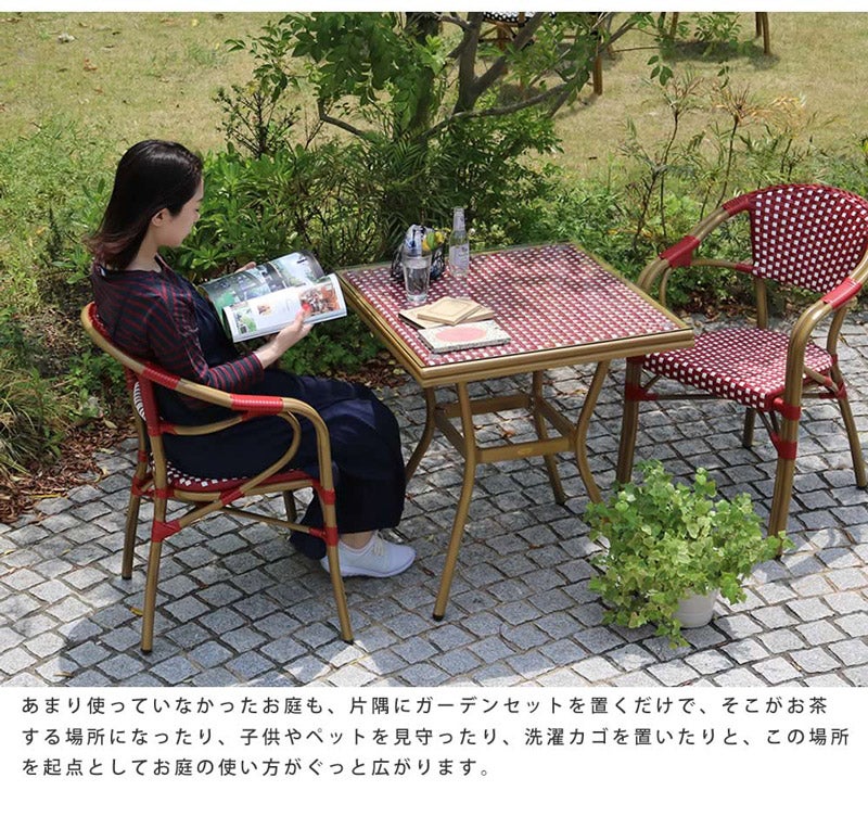 他の画像を見る テラスが映える、カフェ風ガーデンファニチャー3点セット 【メーカー直送品 約1週間で発送】スクエアテーブル3点セット プレジール ブラック レッド 販売価格 ¥ 65,000 税込 詳細を見る お気に入りに登録する