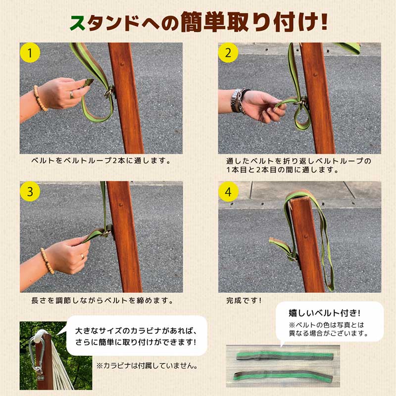 【ご使用前】:ハンモックやスタンドのロープに捻れや断裂がないかどうか、ハンモックとロープが適正な長さかご確認下さい。