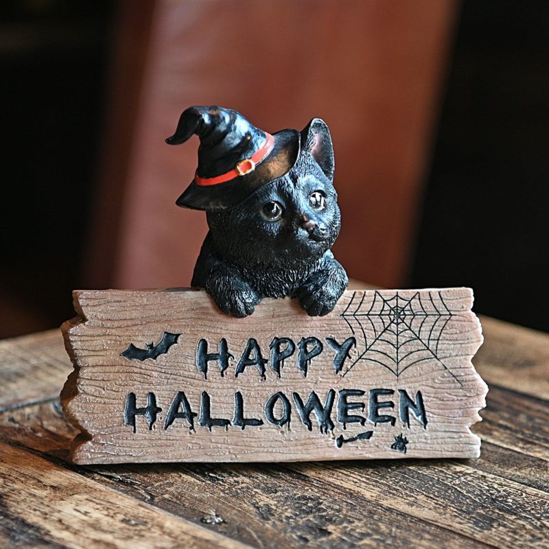 魔女帽子をかぶった黒ねこが今にもいらずらしてきそう。