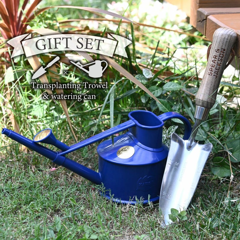 室内の観葉植物の植え替えに便利な細いハンドスコップ(移植ごて)と、置いておくだけでオシャレな英国HAWSの小型じょうろのセットです。