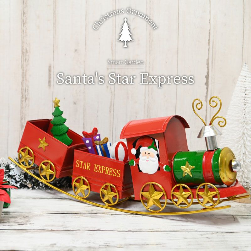 サンタさんが列車に乗ってプレゼントを届けに走っている、見ているだけで楽しくなるオーナメントです。