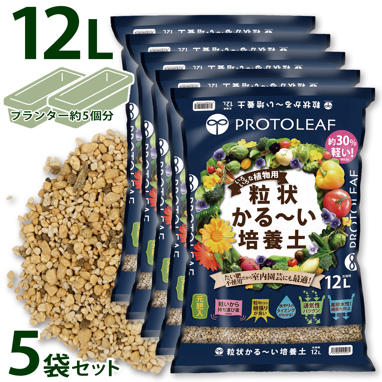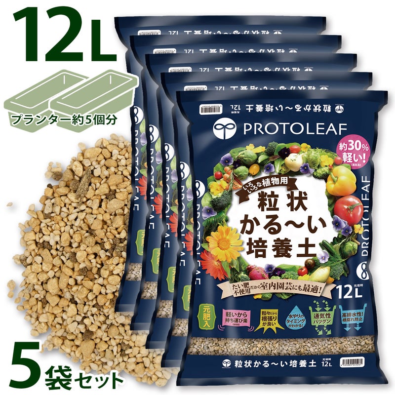 プロトリーフ 粒状かる~い培養土 12L×5袋セット 元肥入り 用土 軽い 軽量 家庭菜園 ベランダ菜園
