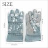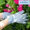 水色・白・アイボリーの落ち着いた色合いで、可愛らしいピーターラビットのイラストがちりばめられたガーデニンググローブです。