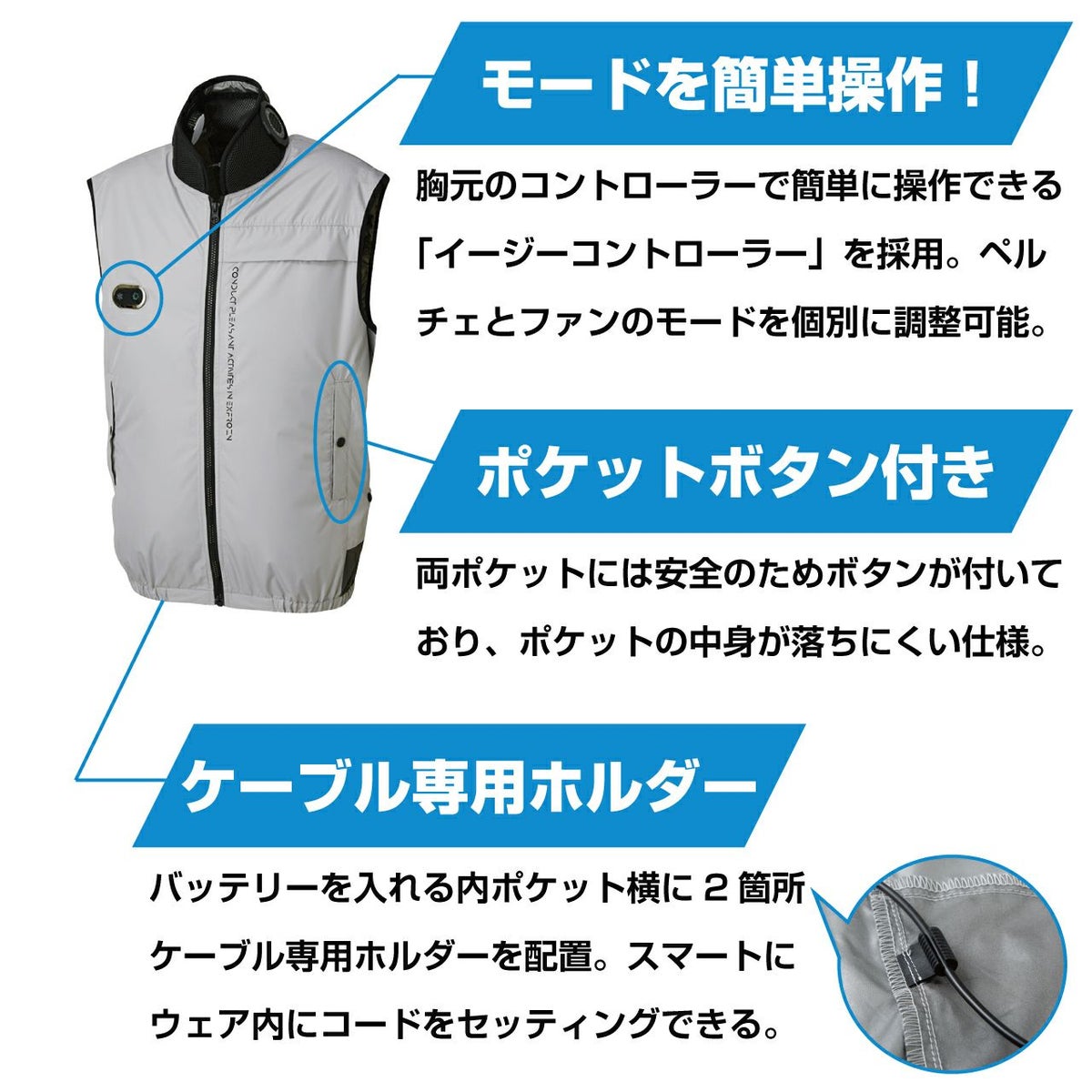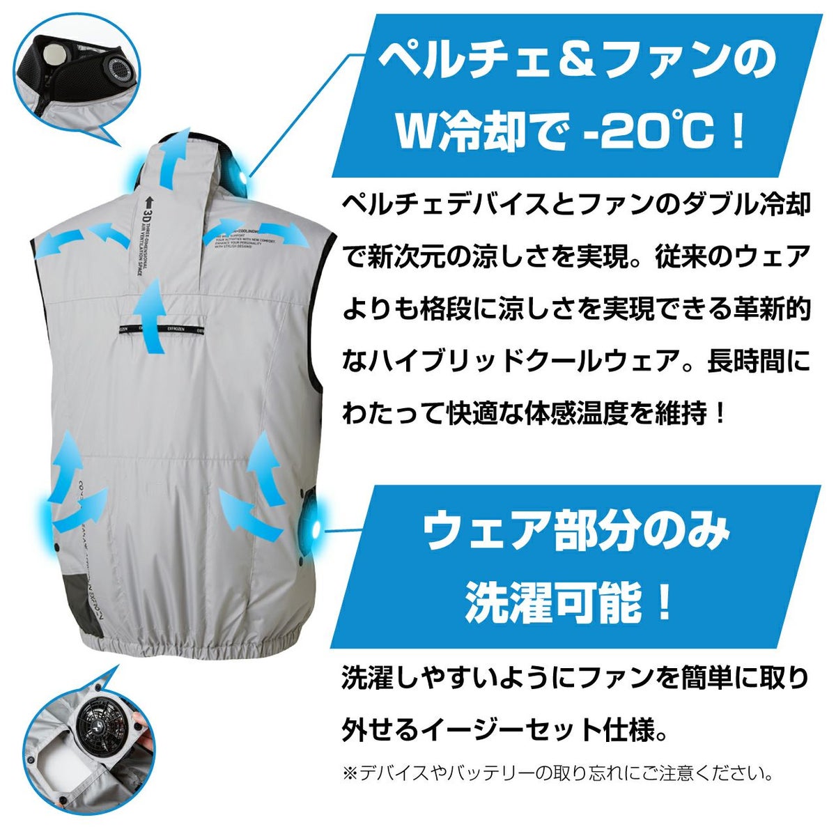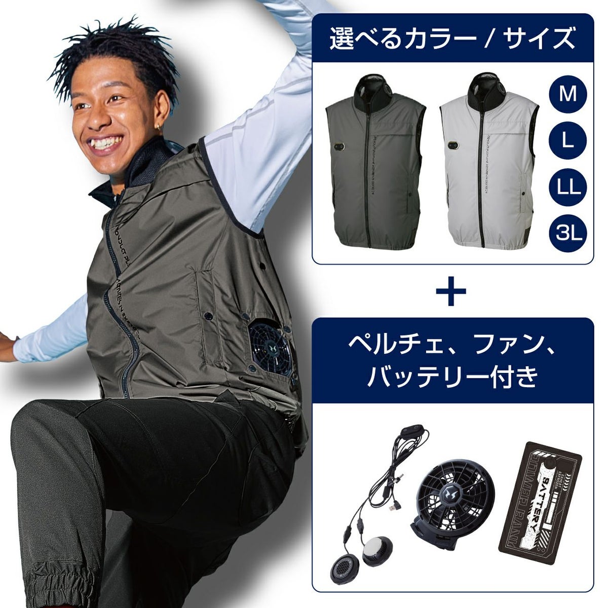 他の画像を見る 猛暑対策の決定版!革新的なペルチェ×ファンのW搭載で速攻冷却! ハイブリットクールウェアベスト(セット) 選べる色とサイズ シルバー アイアングレー Mサイズ Lサイズ LLサイズ 3Lサイズ ペルチェ ファン 販売価格 ¥ 23,760 税込 在庫切れ カートに入れる お気に入りに登録する