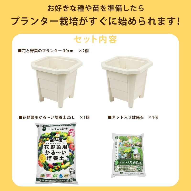 他の画像を見る プランター2個・培養土・鉢底石の4点セット! ガーデニングや、家庭菜園がすぐにはじめられるおすすめセット! プランター園芸4点セット ホワイト 30cmプランター2個&プロトリーフ培養土25L&鉢底石ネット入り 販売価格 ¥ 3,980 税込 カートに入れる お気に入りに登録する