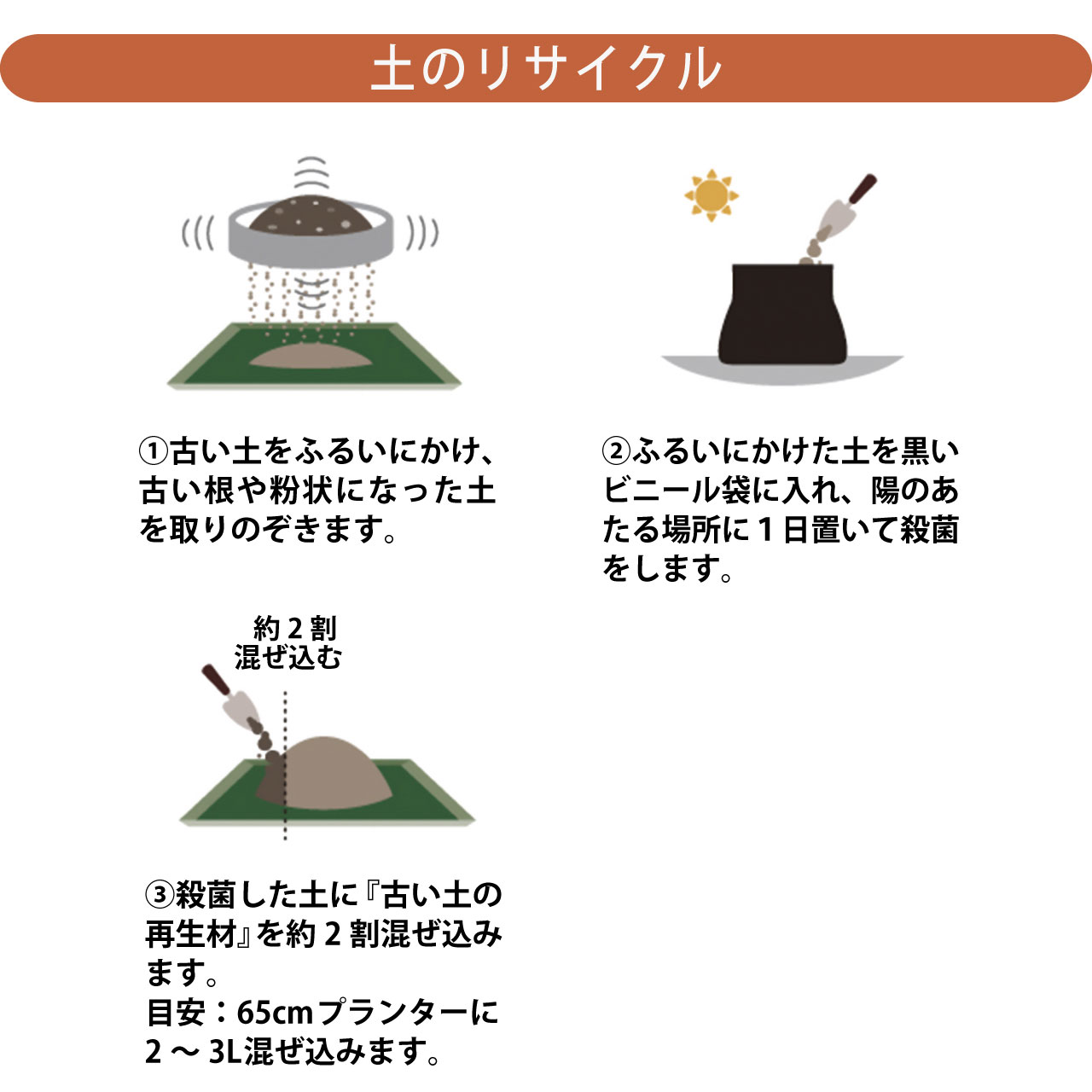 「プロトリーフ 古い土の再生材」は1度使った土に混ぜ込むことにより、植物の成長に必要な栄養素が補給され、土の団粒構造を作り出し、ふかふかの土にします。