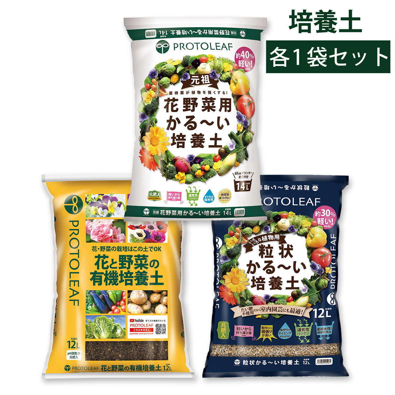 当店1番人気の「かる~い培養土」、虫が寄り付きにくい「粒状培養土」、たい肥入りの「有機培養土」の3種類がセットになっています。
