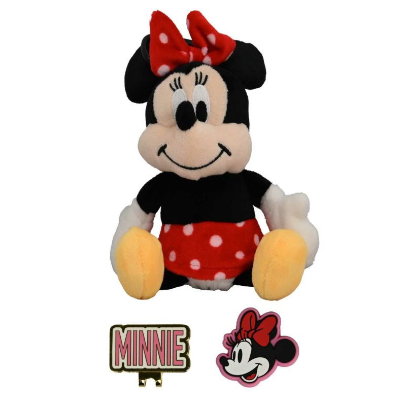 ディズニーキャラクターでおなじみミニーマウスのぬいぐるみポーチとMINNIKE文字入り台座付きゴルフマーカーのセットです。