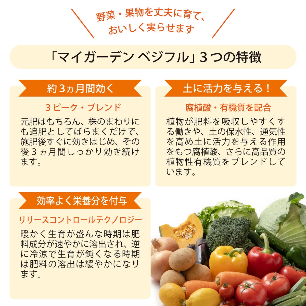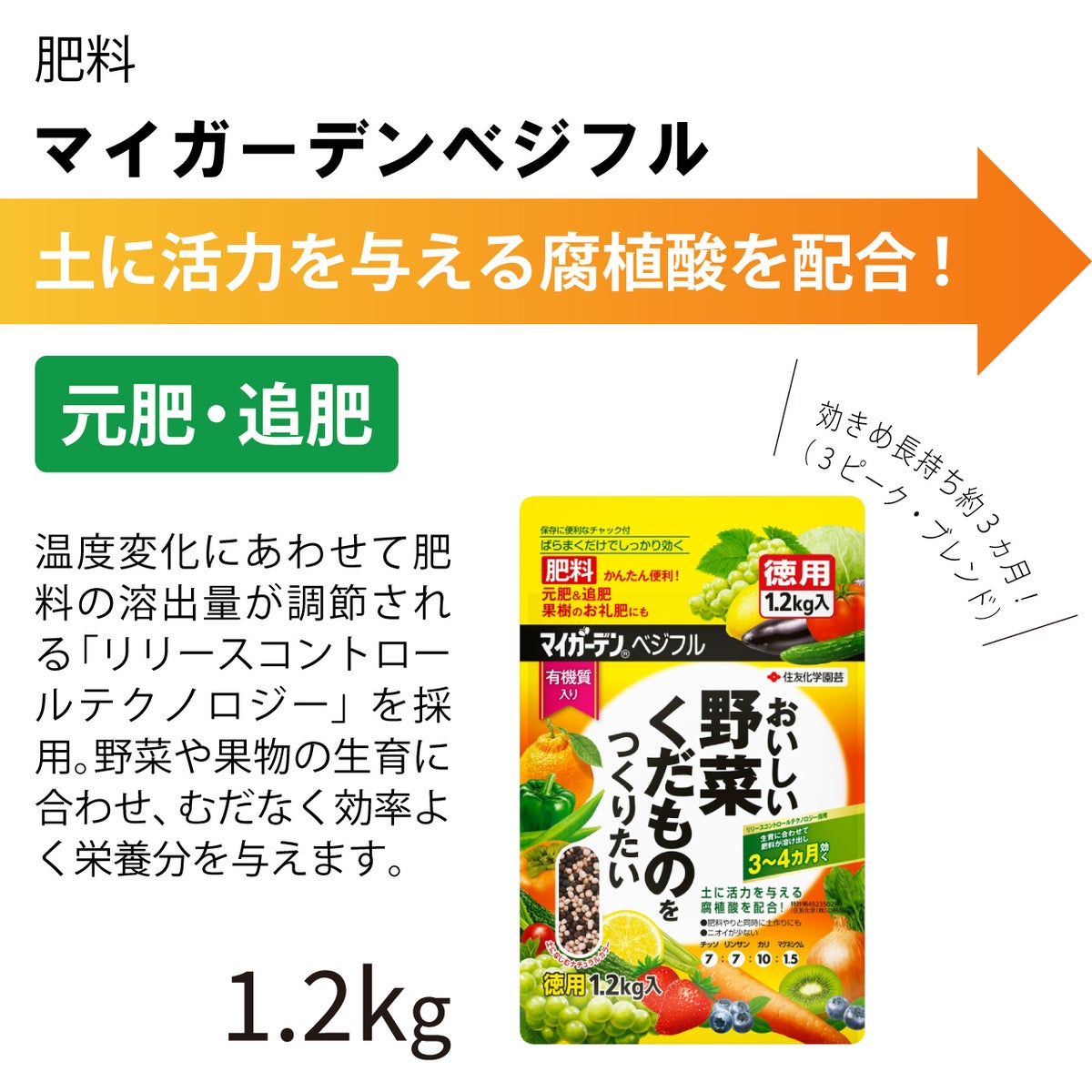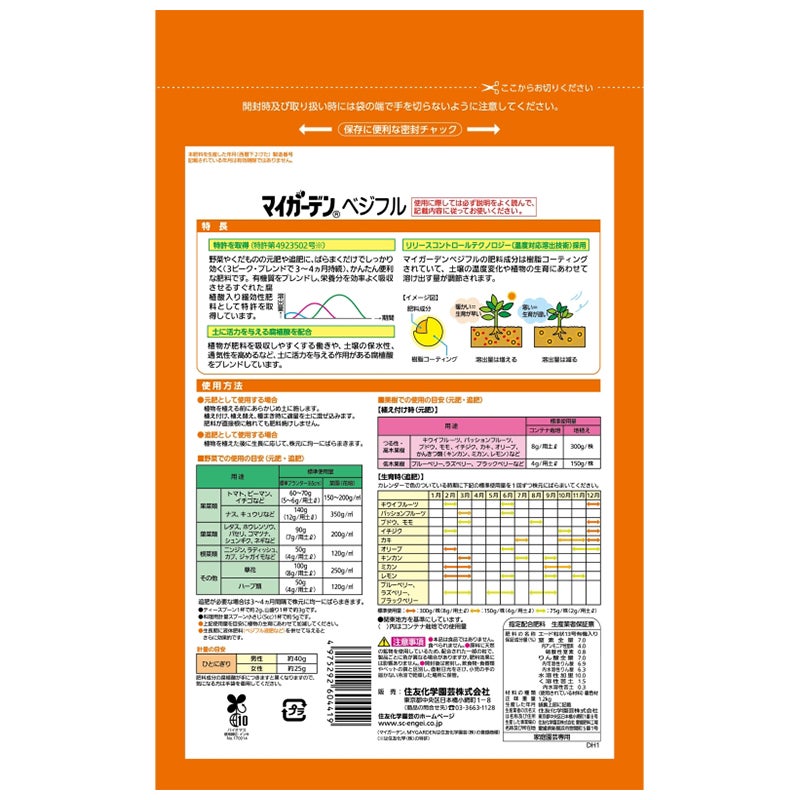 他の画像を見る 元肥・追肥に使え約3ヵ月効く! 住友化学園芸 マイガーデン ベジフル 1.2kg 1袋 野菜の肥料 KINCHO園芸 販売価格 ¥ 1,870 税込 カートに入れる お気に入りに登録する