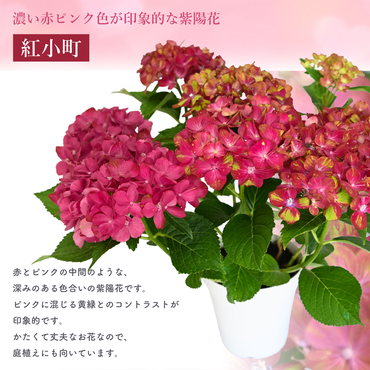 濃い赤ピンク色の紫陽花 紅小町。