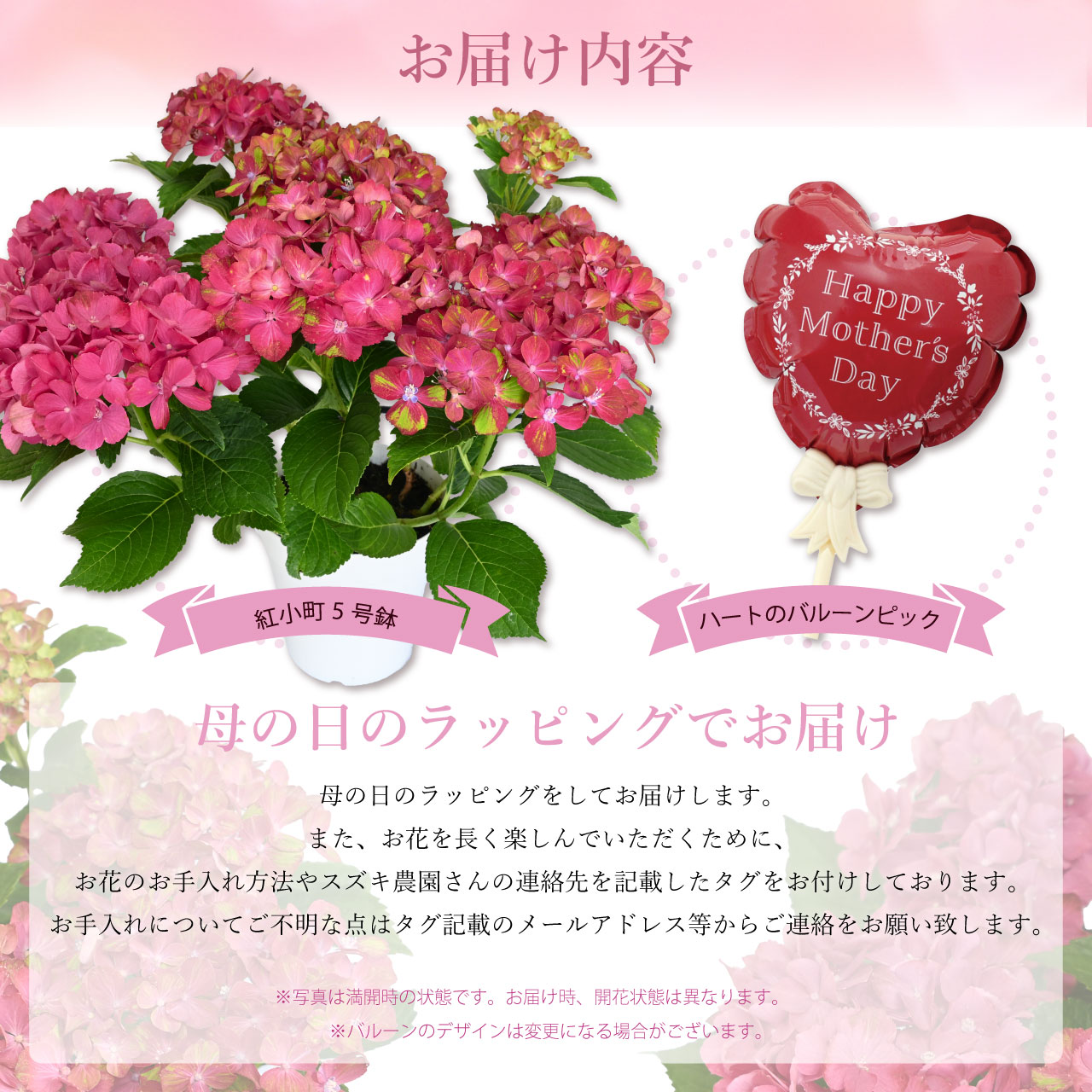 ※お花のお手入れ方法やスズキ農園さんの連絡先を記載したタグをお付けしております。紫陽花の育て方が分からないお母さんにも安心してお贈りいただけます。