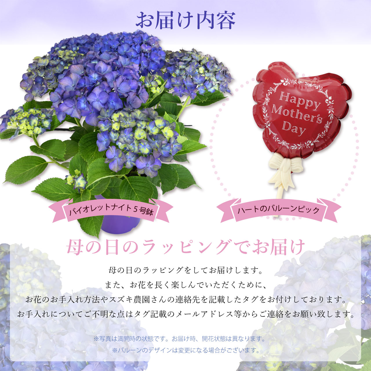 ※お花のお手入れ方法やスズキ農園さんの連絡先を記載したタグをお付けしております。紫陽花の育て方が分からないお母さんにも安心してお贈りいただけます。