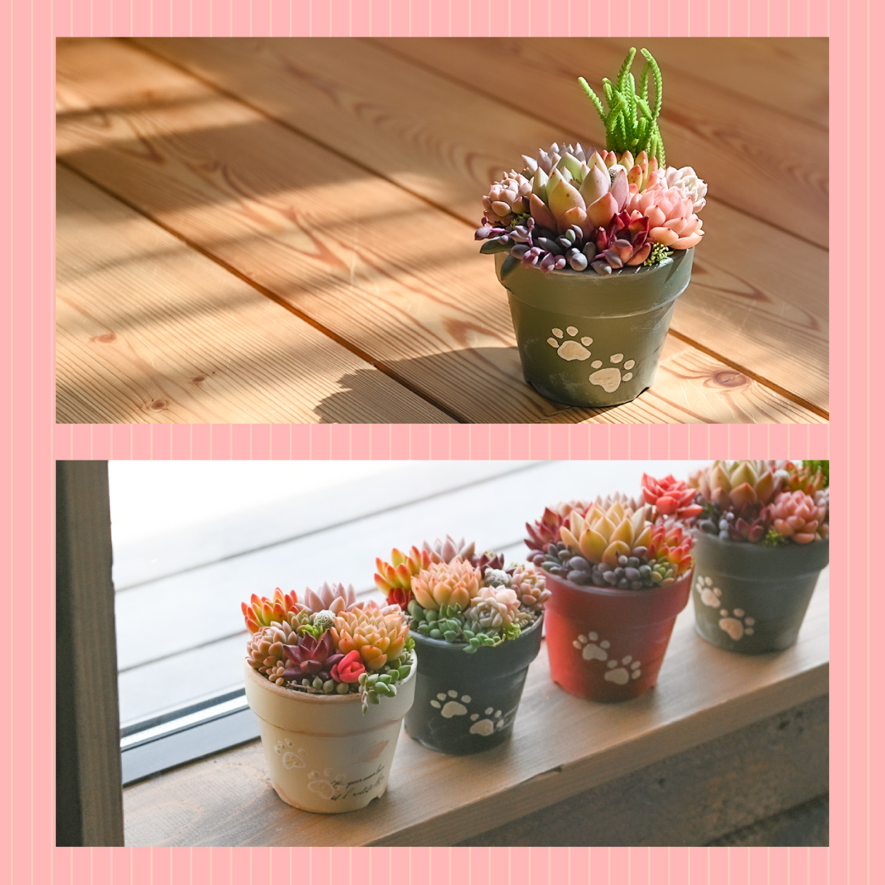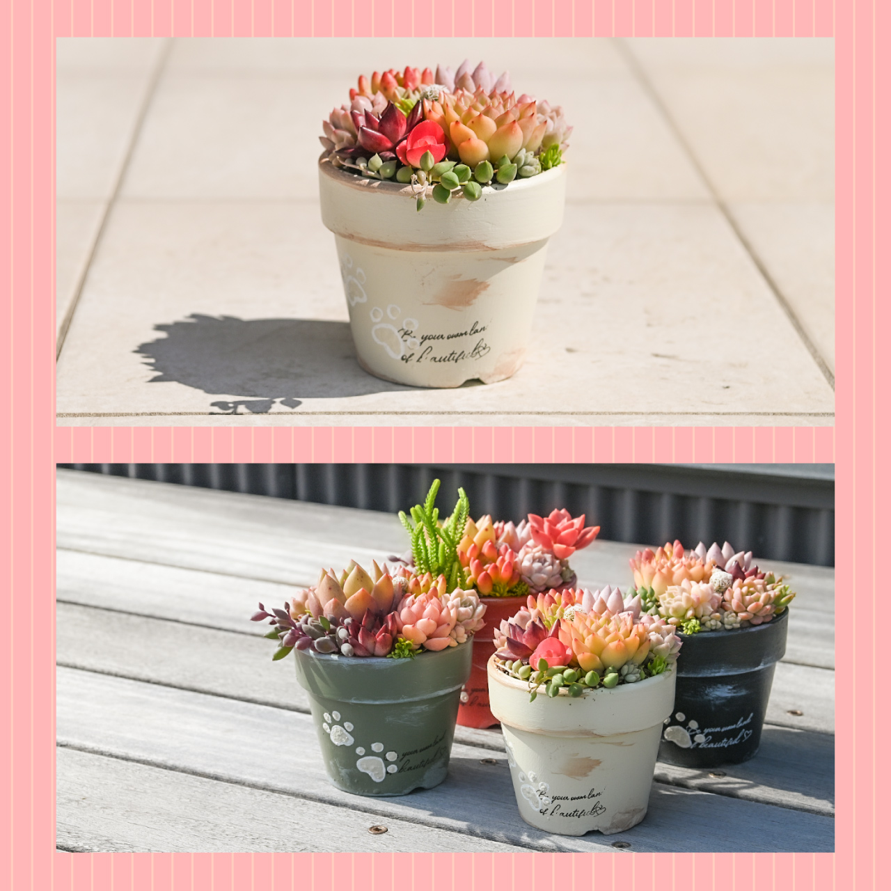 ハンドメイドの鉢に、ひとつひとつ丁寧に多肉植物を寄せ植えました。
