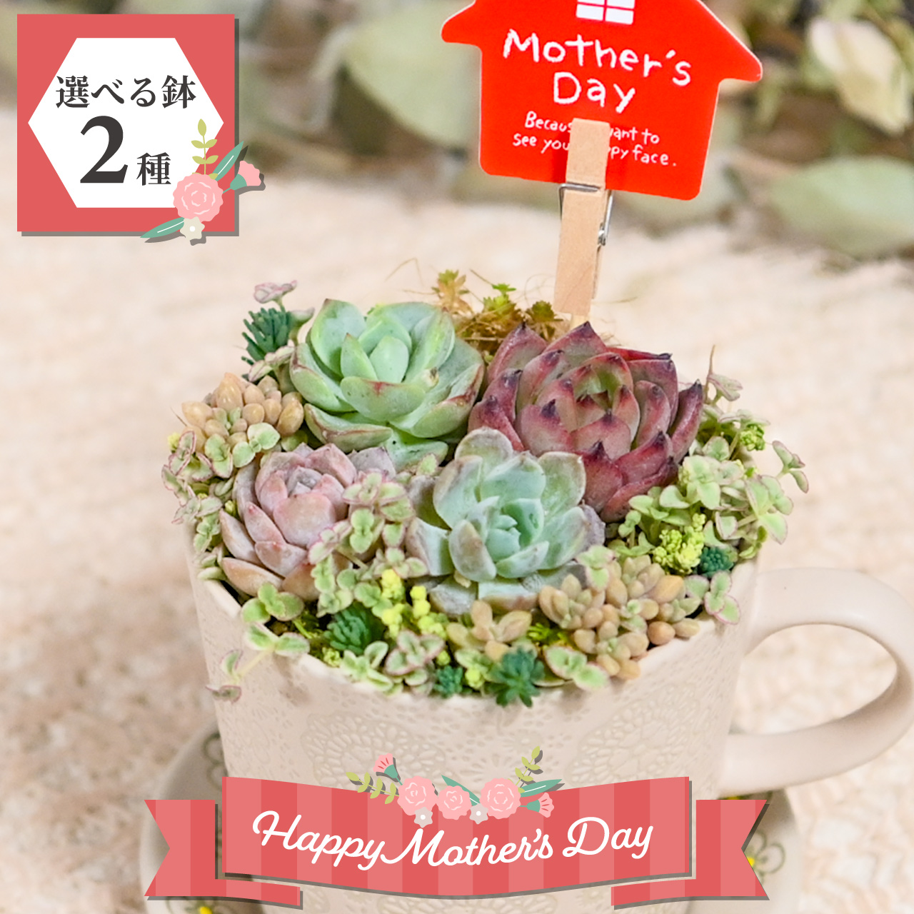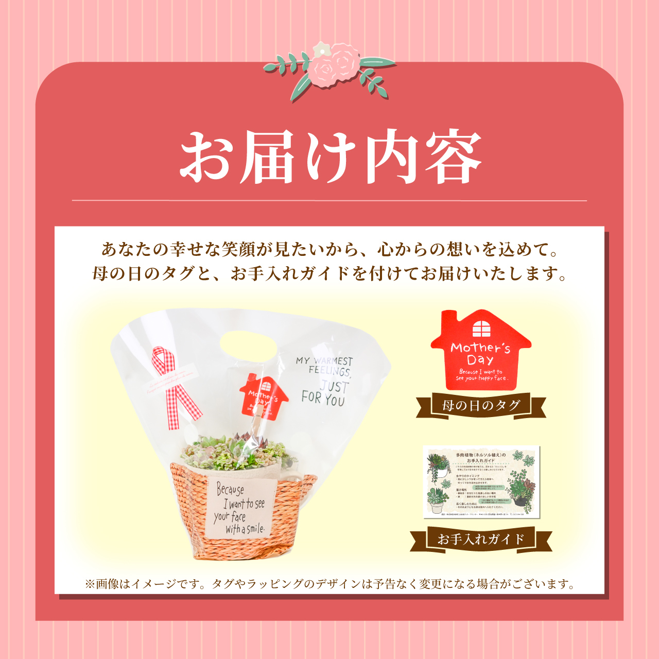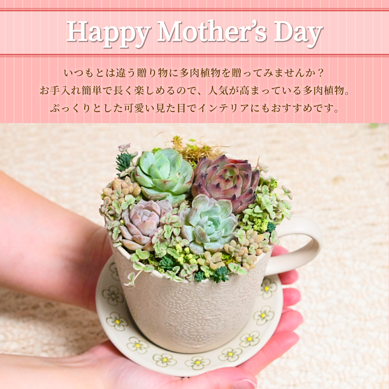 ※多肉植物のお手入れ方法を記載したカードをお付けしております。多肉植物の育て方が分からないお母さんにも安心してお贈りいただけます。