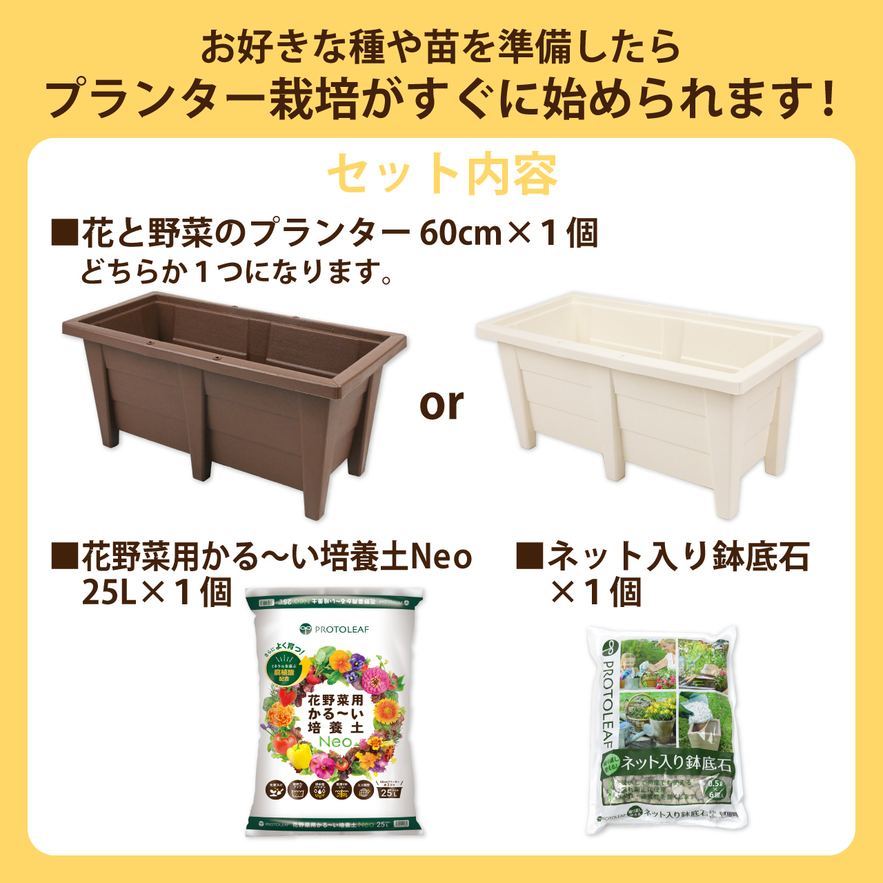 プランター1個・培養土・鉢底石の3点セットです。
