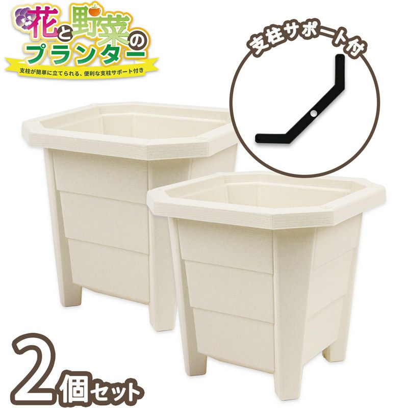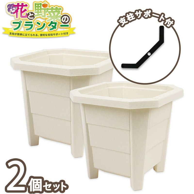 花と野菜のプランター スクエアー 30cm ホワイト 2個セット 支柱サポート付き