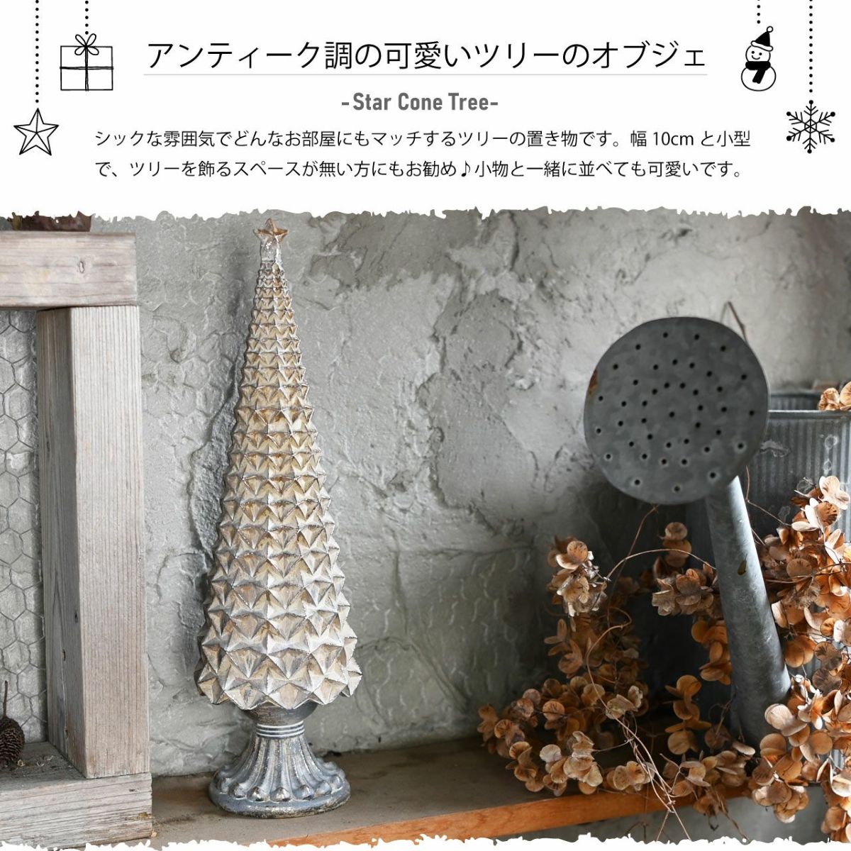 他の画像を見る お家やお庭にクリスマス雑貨を飾って楽しもう! キラキラのラメがオシャレなツリーの置き物 クリスマス オーナメント スターコーンツリー 高さ34cm 飾り 置物 雑貨 かわいい おしゃれ ポリレジン オブジェ アンティーク 販売価格 ¥ 4,280 税込 カートに入れる お気に入りに登録する
