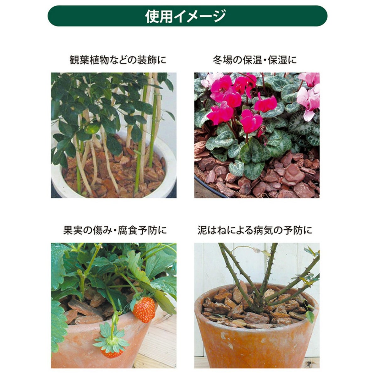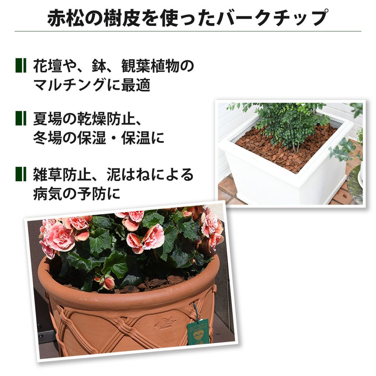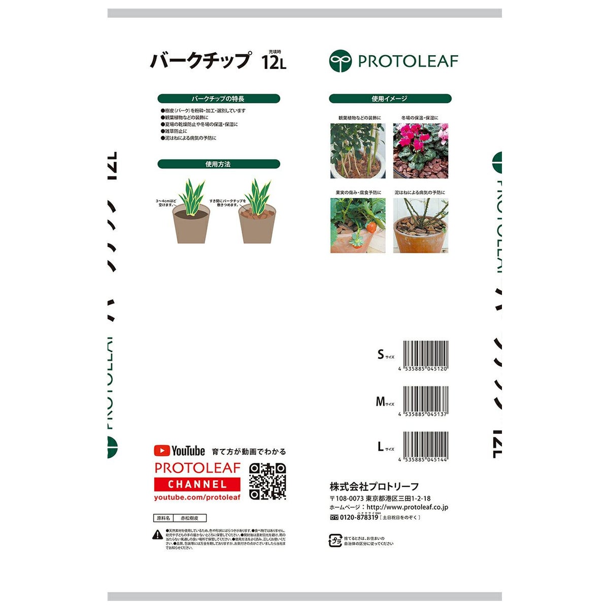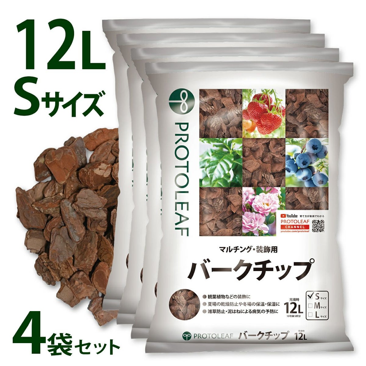 他の画像を見る 装飾はもちろんマルチング材として雑草防止・泥跳ねによる病気の予防に プロトリーフ バークチップ Sサイズ 12L 4袋セット 販売価格 ¥ 7,180 税込 カートに入れる お気に入りに登録する