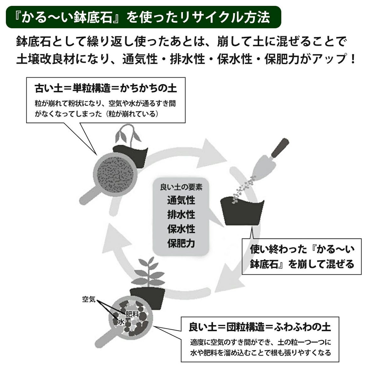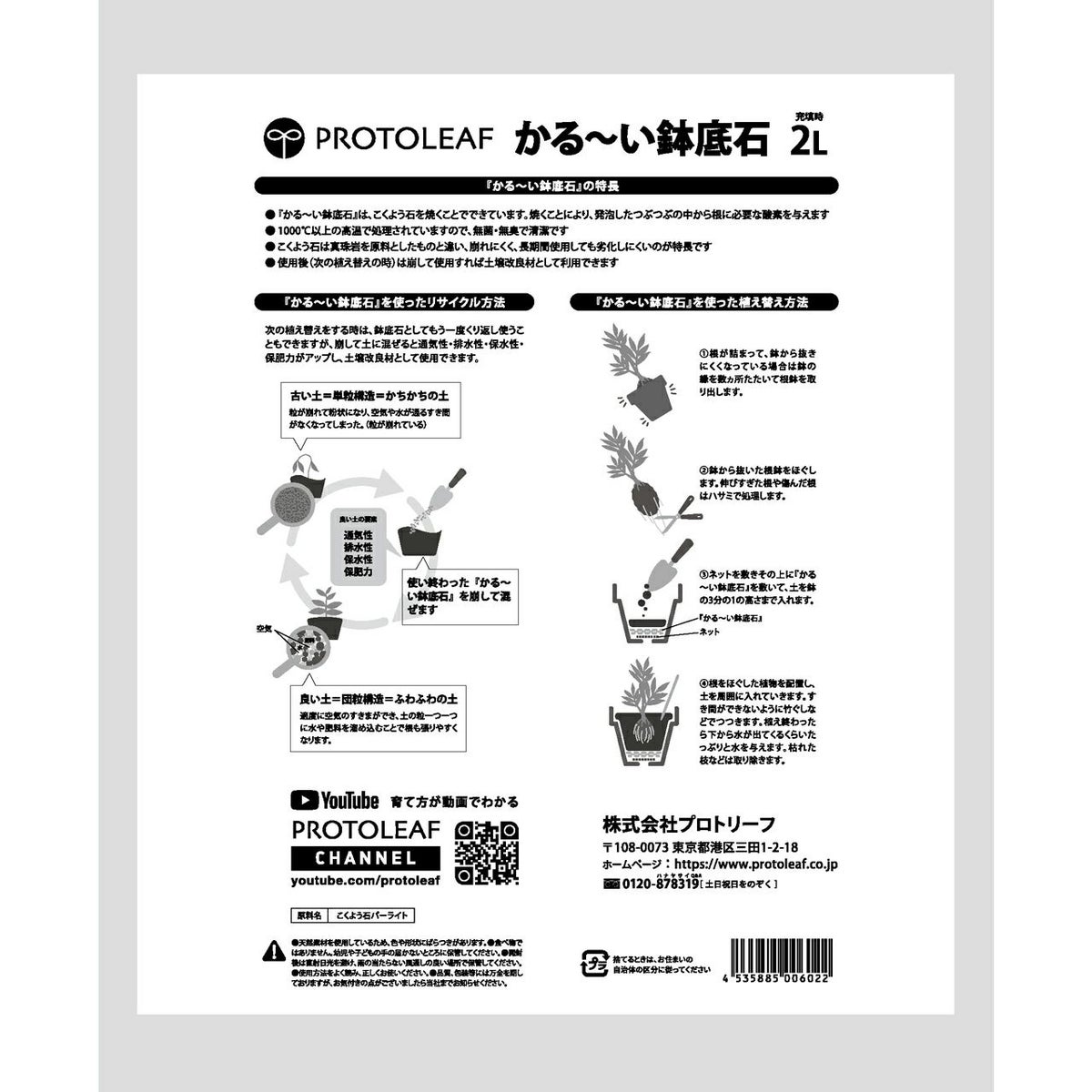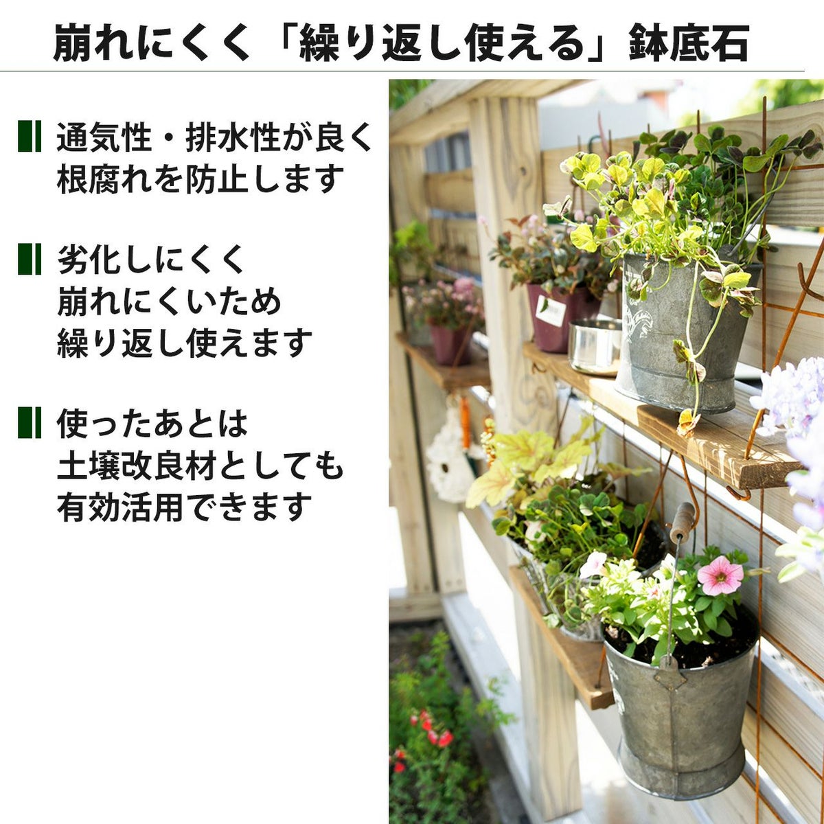 他の画像を見る 崩れにくく繰り返し使える鉢底石!使ったあとは土の改良材としても活用できます プロトリーフ かる~い鉢底石 2L×2袋セット 販売価格 ¥ 1,650 税込 カートに入れる お気に入りに登録する