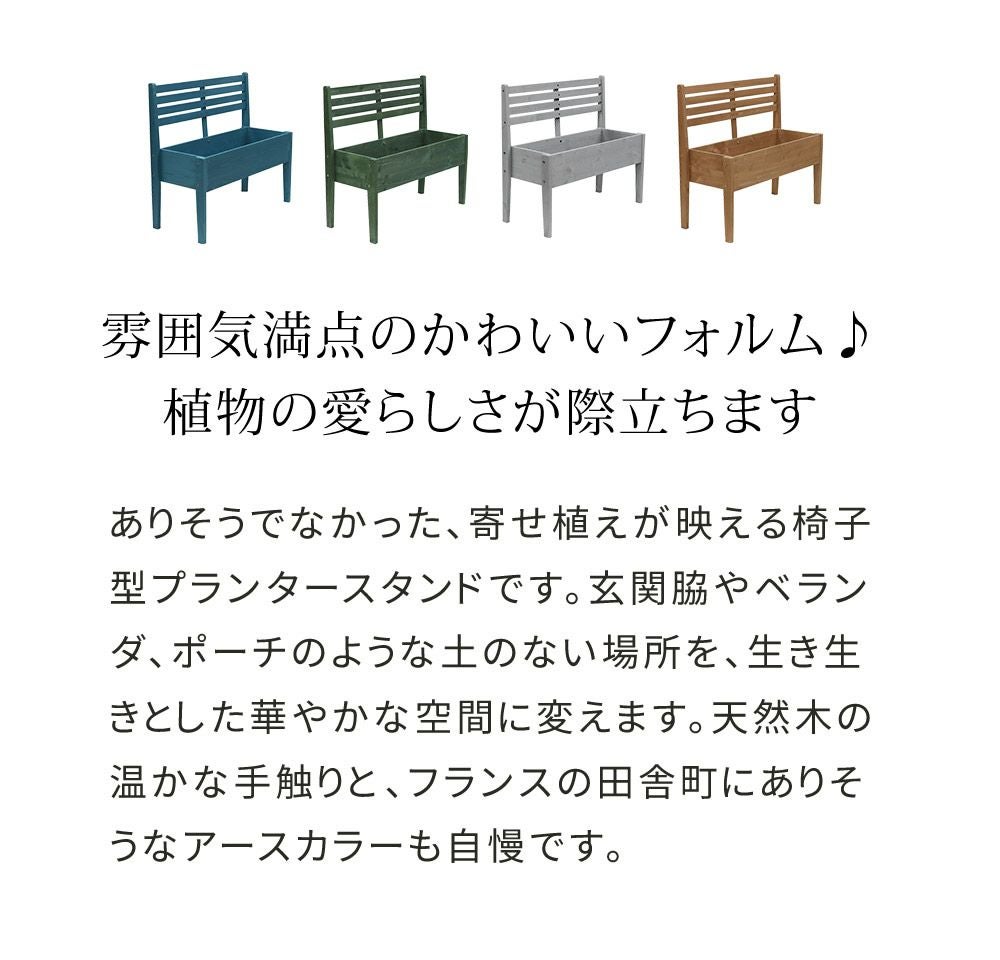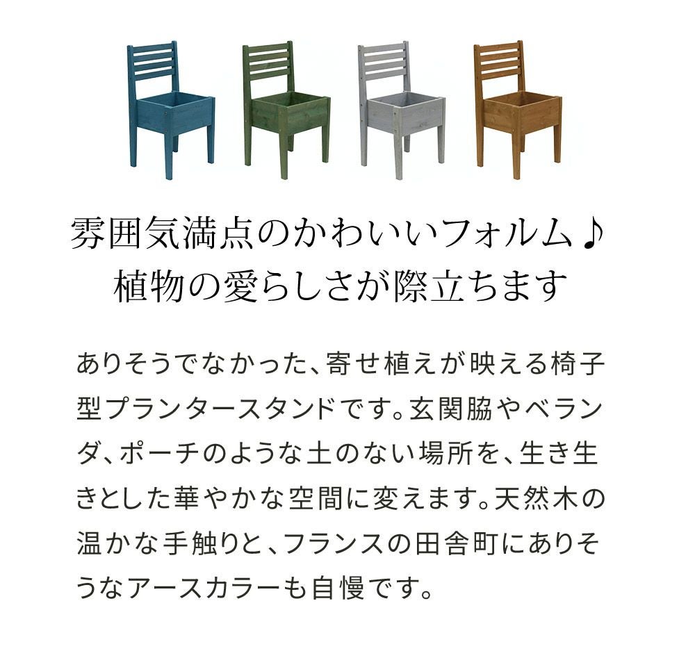 他の画像を見る 雰囲気満点のかわいいフォルム♪寄せ植えが映える椅子型プランタースタンド! 【メーカー直送品 約1週間で発送】天然木製チェア型プランター 幅80cm ブルー ダークグリーン グレー ライトブラウン 販売価格 ¥ 8,300 税込 詳細を見る お気に入りに登録する