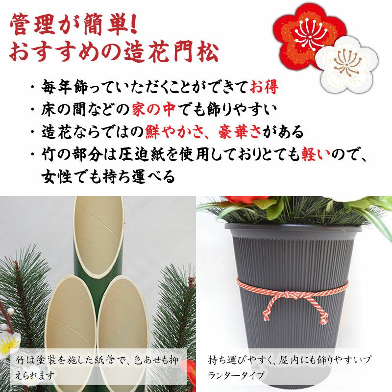 他の画像を見る 紅白の縁起物飾りで華やかに玄関、門を彩ります 毎年使えてエコでお得な造花(人工)門松 【予約注文品】毎年繰り返し使える造花 人工 門松 高さ75cm 1本 産地直送 販売価格 ¥ 19,800 税込 販売を終了しました。 在庫切れ 詳細を見る お気に入りに登録する