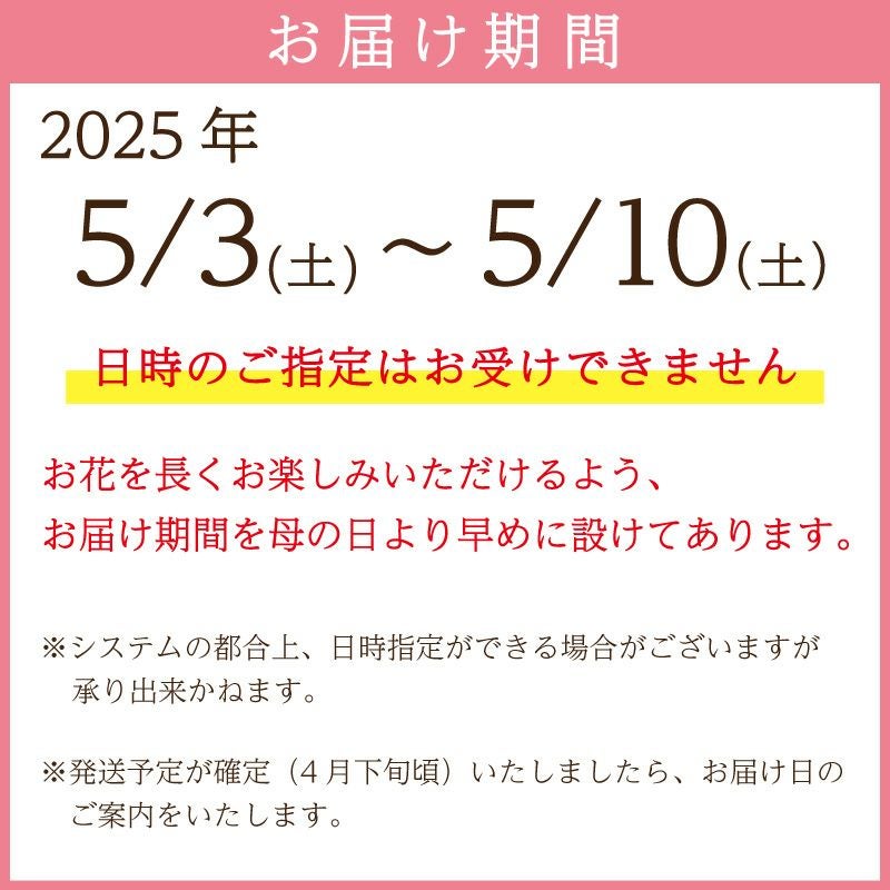 他の画像を見る 大好きなお母さんの笑顔が見たいから、 日頃の感謝の気持ちをお花に込めて贈ります。 7号鉢 2色植え 幻の薔薇 ピンク&サマースノー 母の日プレゼント用ラッピング付 2025年 花 ローズ 鉢植え ハルガスミ つる薔薇 花鉢 送料無料 販売価格 ¥ 8,800 税込 販売を終了しました。 在庫切れ 詳細を見る お気に入りに登録する