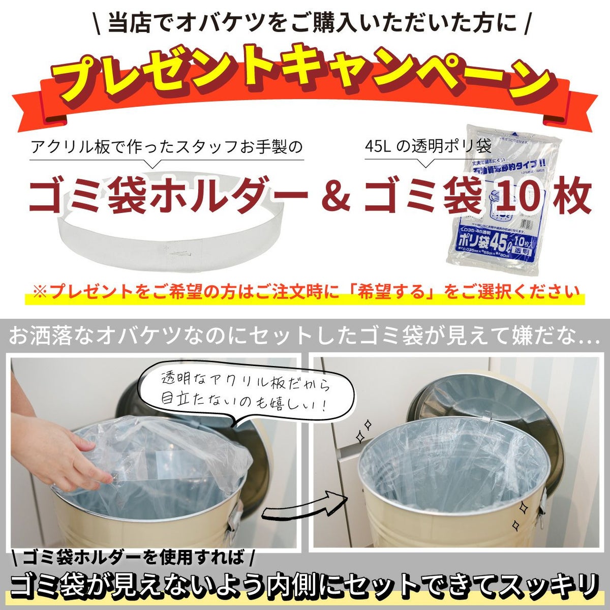 他の画像を見る 毎日使いたくなるおしゃれな見た目で、職人が丁寧に作り上げた高品質なゴミ箱です。 当店オリジナルのゴミ袋ホルダーと45Lのゴミ袋10枚をプレゼント! 【ホルダー・ゴミ袋のおまけ付き】オバケツ 42L キャスター付 日本製 選べる5色 販売価格 ¥ 9,350 税込 在庫切れ 詳細を見る お気に入りに登録する