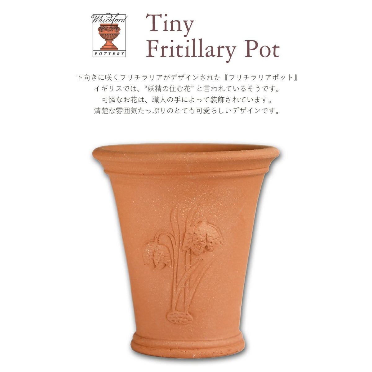 他の画像を見る 世界に一つだけのWhichfordのテラコッタ鉢。 芸術品とも呼べる上品で美しい植木鉢は一生モノとして愛用できます。 英国 ウィッチフォード フリチラリアポット 直径17cm 植木鉢 Whichford 販売価格 ¥ 5,830 税込 在庫切れ 詳細を見る お気に入りに登録する