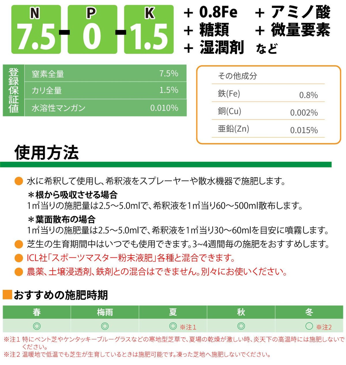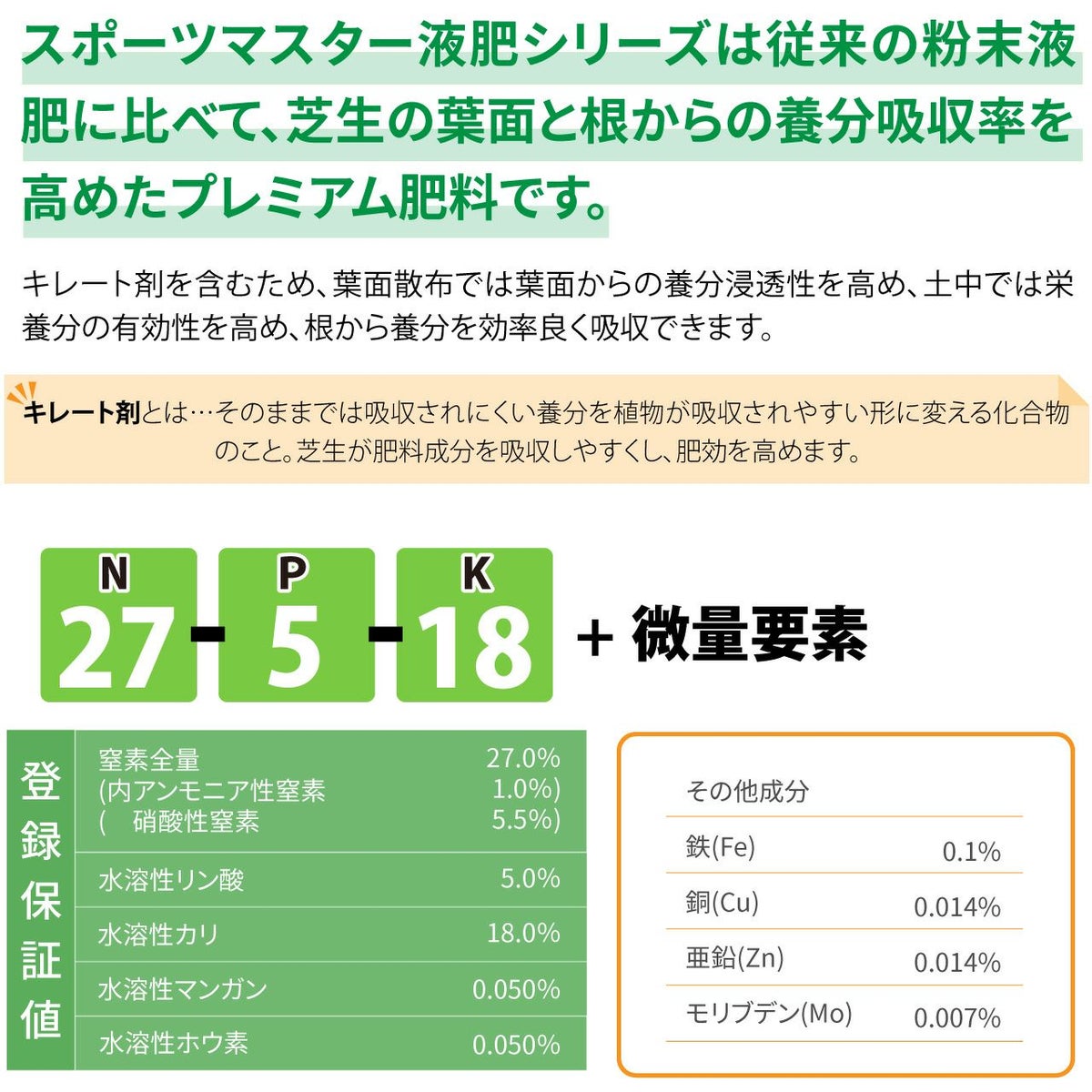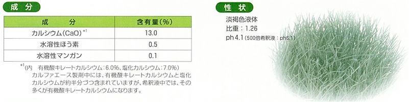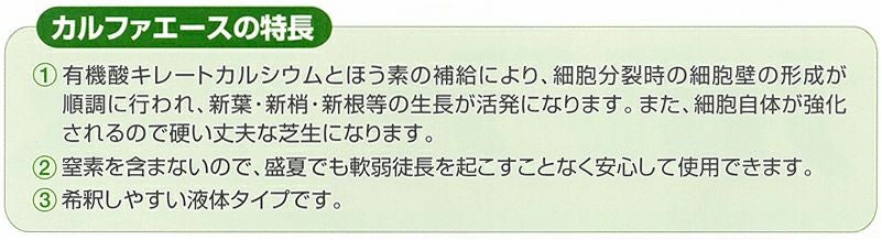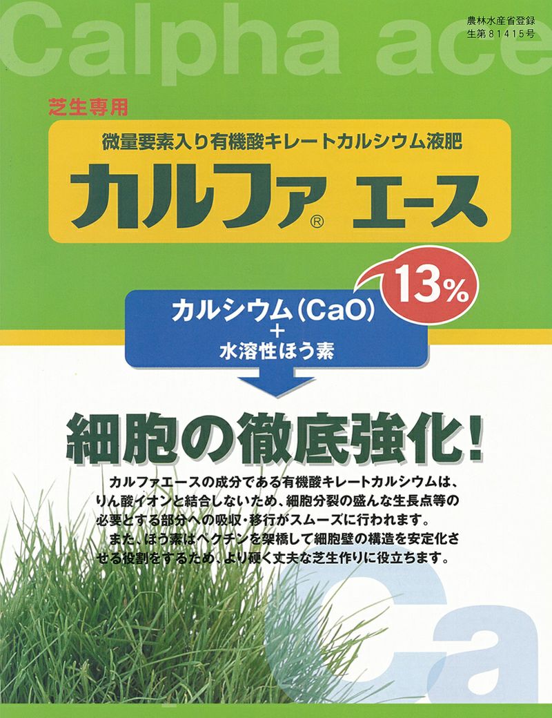 他の画像を見る /使用説明書付き/芝生の細胞の徹底強化をはかる液肥です。 芝生専用微量要素入り有機酸キレートカルシウム肥料 液肥 カルファエース1L入り 販売価格 ¥ 4,980 税込 カートに入れる お気に入りに登録する