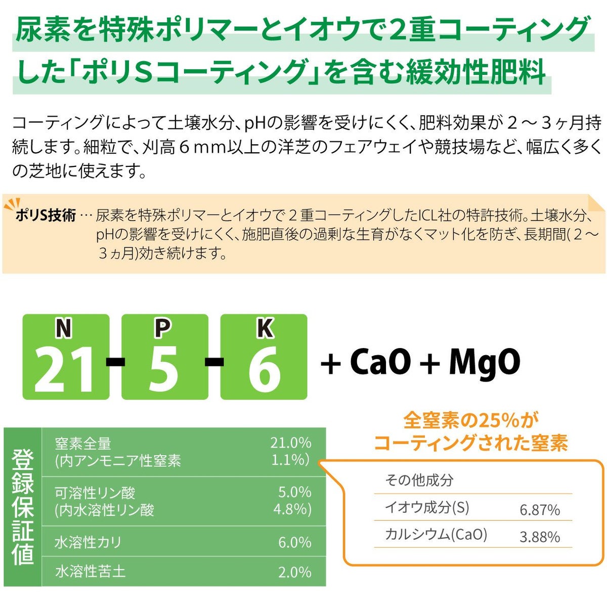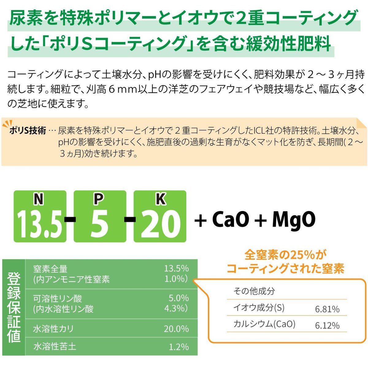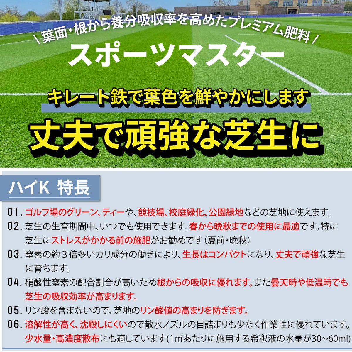 他の画像を見る ゴルフ場で使われているプロ用化成肥料。丈夫で硬い芝生を作ります。葉色向上に効果がある芝生専用肥料です。 HYPONeX ICL ポリSプロターフ N・K 25㎏ グラウンド・フェアウェイ用緩効性肥料コーティング ハイポネックス 業務用【予約注文品 約1週間で出荷】 販売価格 ¥ 18,876 税込 カートに入れる お気に入りに登録する