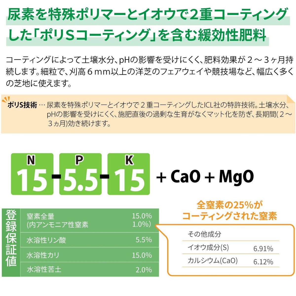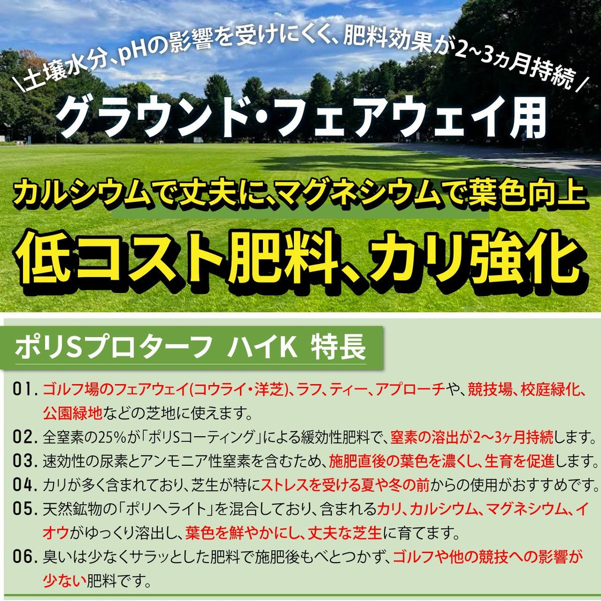 他の画像を見る ゴルフ場で使われているプロ用化成肥料。ティーや競技場など多くの芝地で使われるマグネシウム、カルシウム入りの低コスト芝生専用肥料です。 HYPONeX ICL ポリSプロターフ 25㎏ グラウンド・フェアウェイ用緩効性肥料コーティング ハイポネックス 業務用【予約注文品 約1週間で出荷】 販売価格 ¥ 19,877 税込 カートに入れる お気に入りに登録する