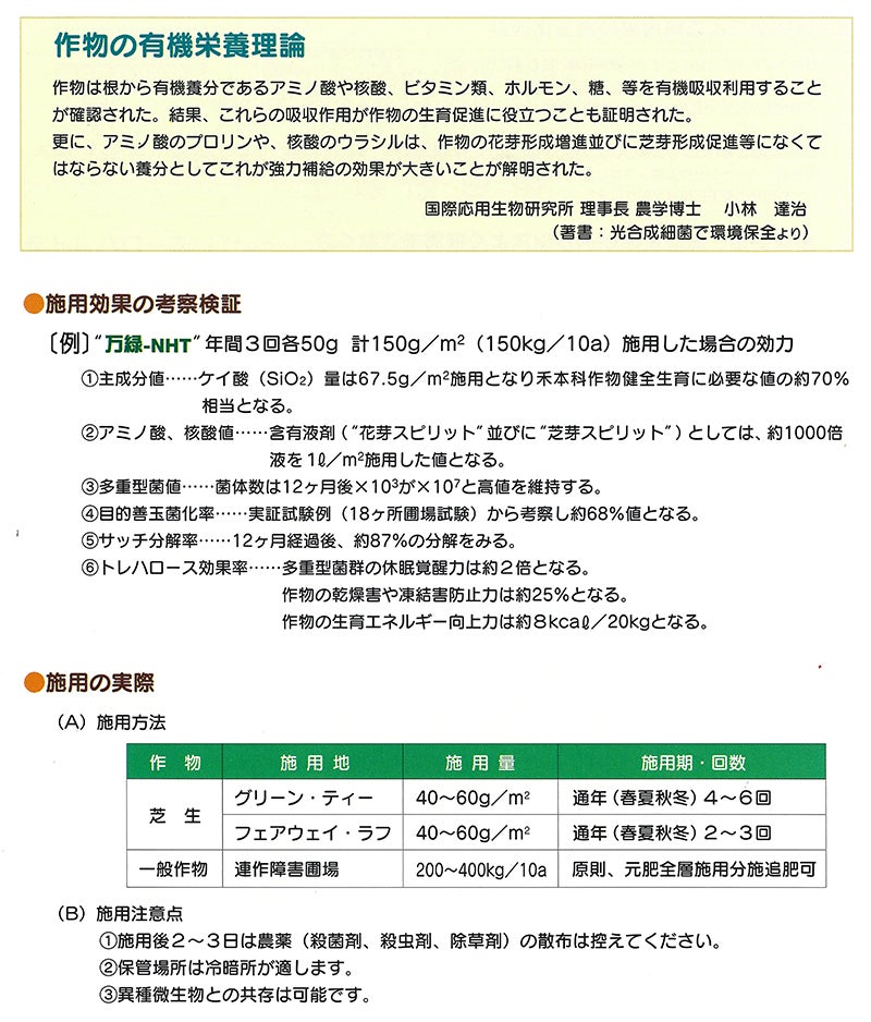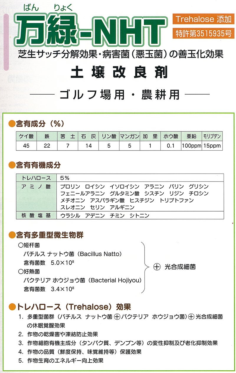 他の画像を見る /使用説明書付き/芝生サッチ分解効果・病害菌(悪玉菌)の善玉化効果 芝生用土壌改良剤 万緑-NHT 5kg 細粒タイプ 販売価格 ¥ 2,800 税込 カートに入れる お気に入りに登録する